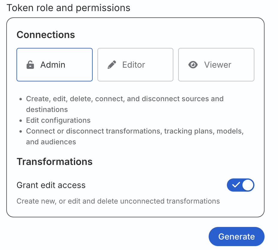 For production use cases, RudderStack recommends using a Service Access Token instead of Personal Access Token.