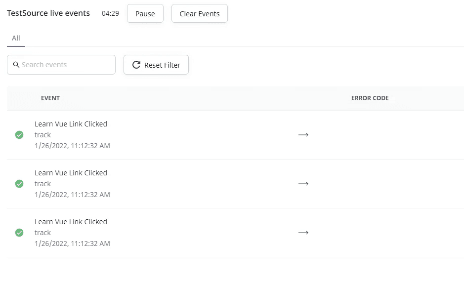 6. Upon successful tracking, you will see the events in your RudderStack dashboard: