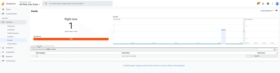 7. To check if the events are delivered successfully to your Google Analytics destination, navigate to the Realtime > Events option on your Google Analytics dashboard.