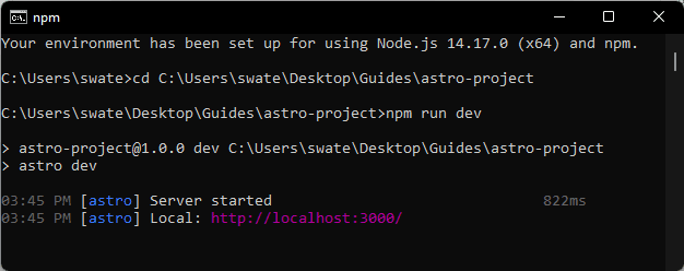 3. Open your Astro site by visiting the server address mentioned in the cmd or http://localhost:3000 on your browser.