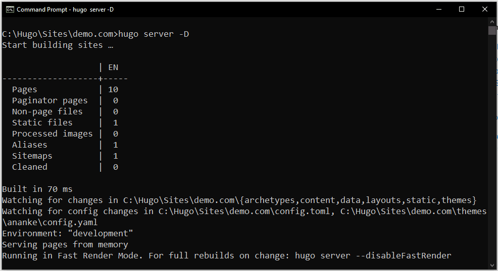 2. To deploy the app, execute the hugo server -D command, as shown: