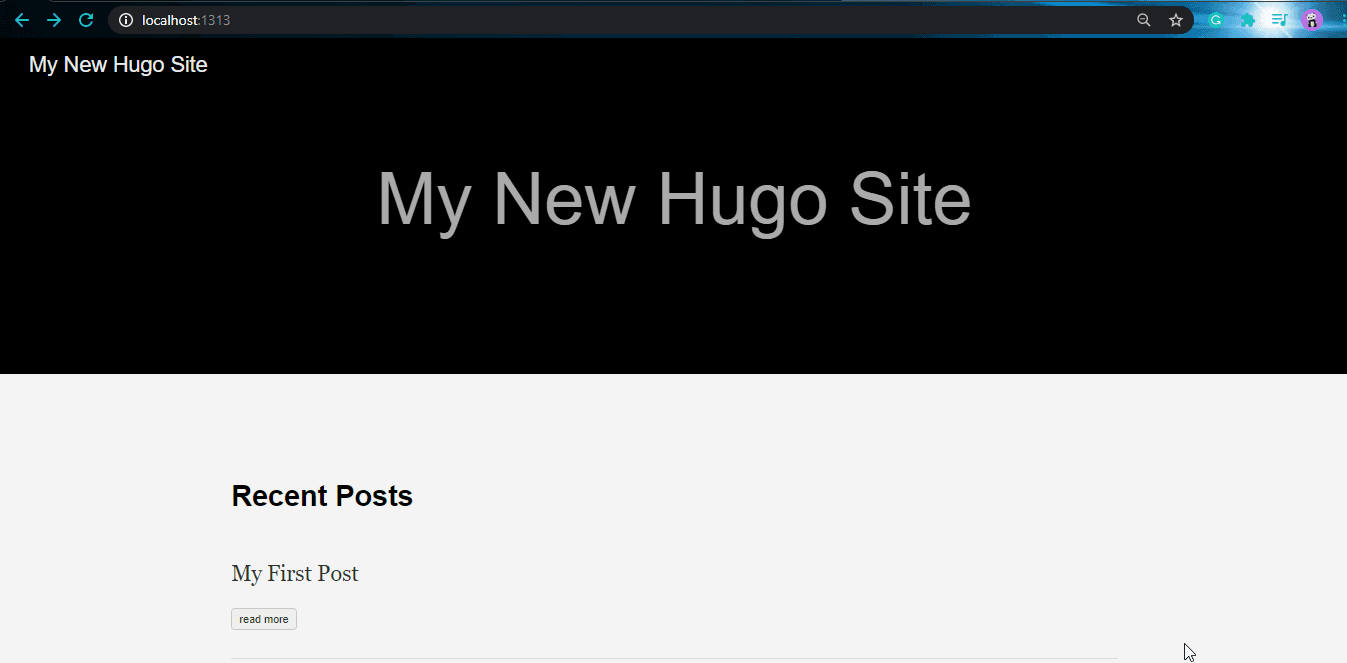 3. Navigate to your Hugo site by visiting the server address mentioned in the cmd or http://localhost:1313/ on your browser.