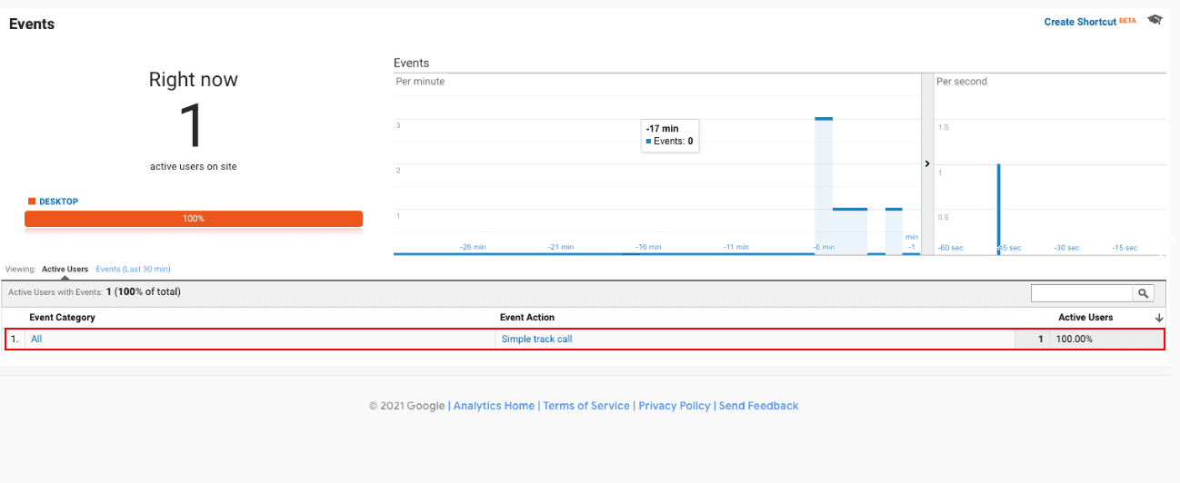 7. Next, check if the events are being sent to your Google Analytics destination. For that, go to your Google Analytics dashboard and navigate to the Realtime > Events option.