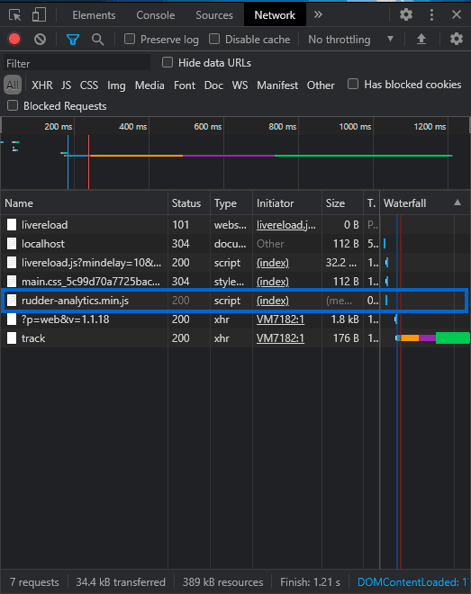 4. Next, verify if rudder-analytics.js (RudderStack’s JavaScript SDK) has loaded correctly. For this, open your browser’s Developer tools and navigate to the Network tab. The following screenshot highlights this option for Google Chrome: