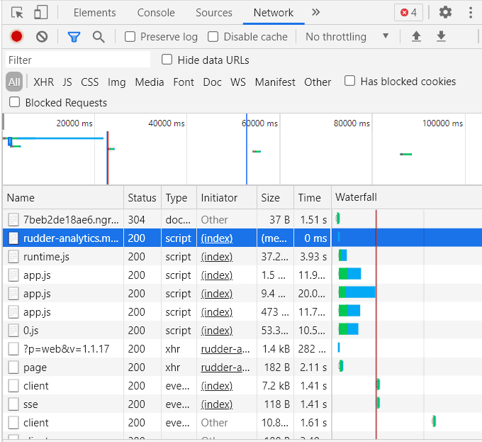 4. To verify if rudder-analytics.js (RudderStack’s JavaScript SDK) has loaded correctly, go to your browser’s Developer tools and navigate to the Network tab. The following screenshot highlights this option for Google Chrome: