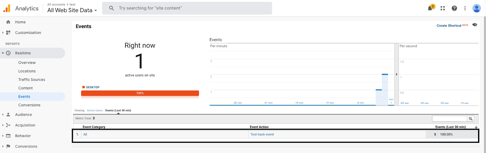 7. Next, let’s check if the events are sent to our Google Analytics destination. Go to your Google Analytics dashboard and navigate to the Realtime - Events option.