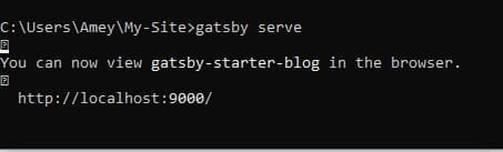 3. Since we are using a production environment, let’s deploy our site using gatsby serve. A localhost URL will be served, which we can then use to access our site: