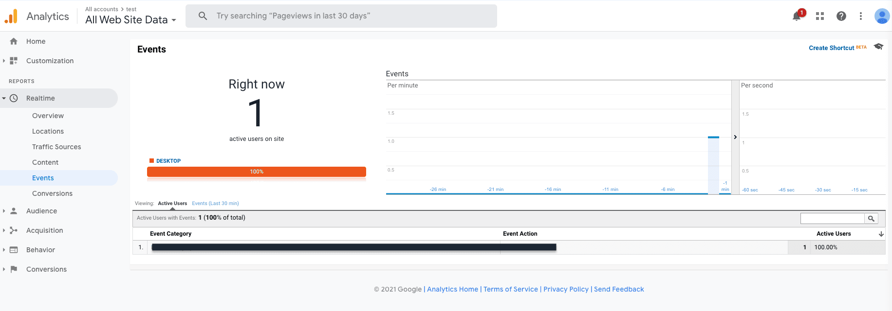 7. Now, let’s check if the events are sent to Google Analytics as well by going to your Google Analytics dashboard and navigating to Realtime - Events.