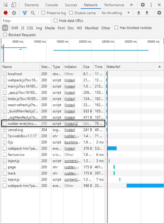 4. To verify if rudder-analytics.js (RudderStack’s JavaScript SDK) has loaded correctly, you can go to your browser's developer tools and navigate to the Network tab. The following screenshot highlights this option for Google Chrome: