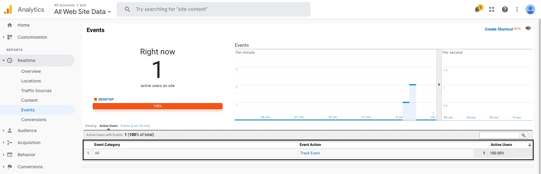 7. Now, let’s check if the events are sent to our Google Analytics destination. Go to your Google Analytics dashboard and navigate to the Realtime - Events option.