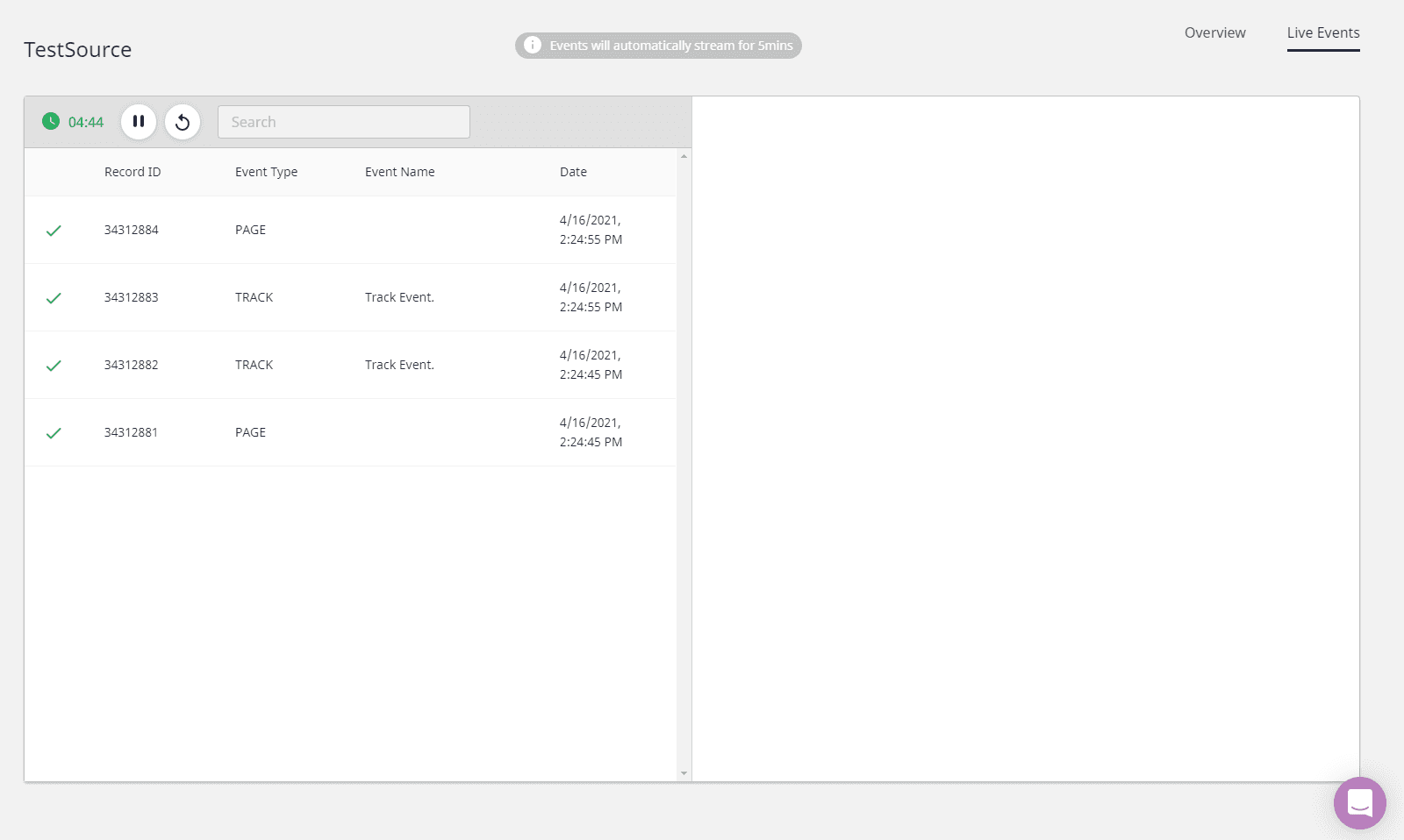 5. See if RudderStack can track the different pageviews and clicks by going to the Live Events tab of your JavaScript source on the RudderStack dashboard page: