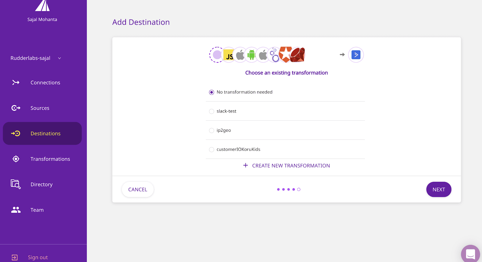 - Step 6: Next, choose the transformation you wish to use. You can write your custom transformation and select it. Else, you can select No transformation needed and click Next.